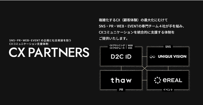 イリアル・D2C ID・ユニークビジョン・thawの4社にてSNS・PR・WEB・EVENT軸にて統合的なCXコミュニケーション支援を行う 『CX PARTNERS』を提供開始