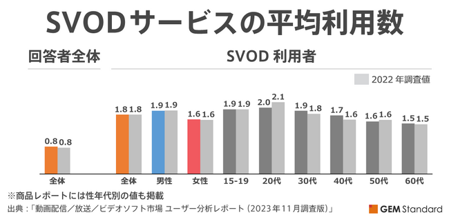 SVODの平均利用数は、市場全体、SVOD利用者全体ともに前年から変化なし