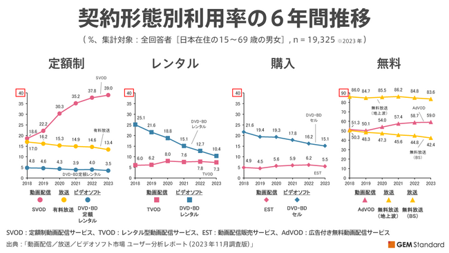 本リリースでは、契約形態、観賞形態を横断した利用率の推移や、SVOD(定額制動画配信)の平均利用数に着目し、レポートから抜粋する形で、ユーザーの利用実態をお知らせいたします。
