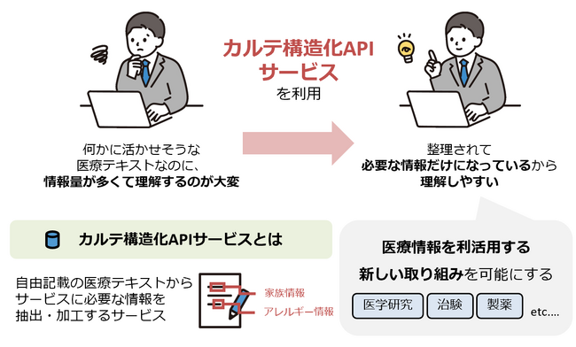 カルテ構造化APIサービスは、医療テキストを目的に応じて整理するサービスです。独自の医療言語処理技術『SATOMI(R)』を応用し、カルテなどの医療テキストを目的に応じた形に自動で整理することで、これまで利用者にかかっていた負担を軽減するとともに、医療情報を利活用する新しい取り組みを可能にします。