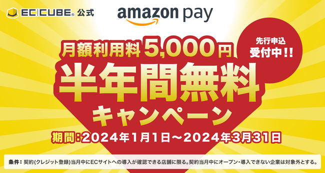 キャンペーン内容:EC-CUBE用Amazon Payプラグインをご契約月から半年間、月額利用料5,000円(税込:5,500円)を無料にいたします。