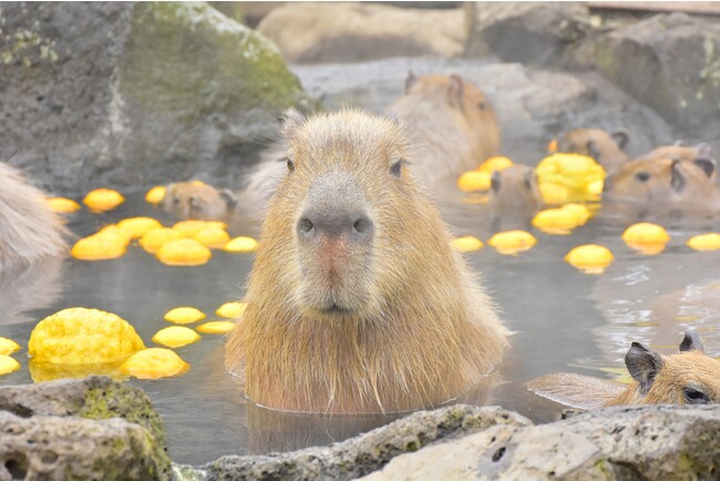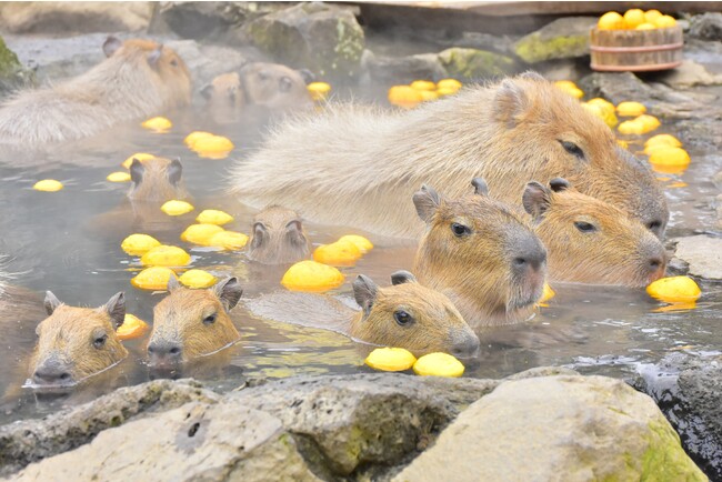 毎年冬至から年末年始にかけての時期に開催しており、ゆずの香りに包まれて気持ちよさそうに入浴するカピバラたちの、のんびりとした姿をお楽しみいただけます。