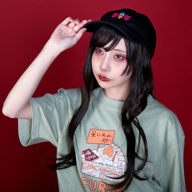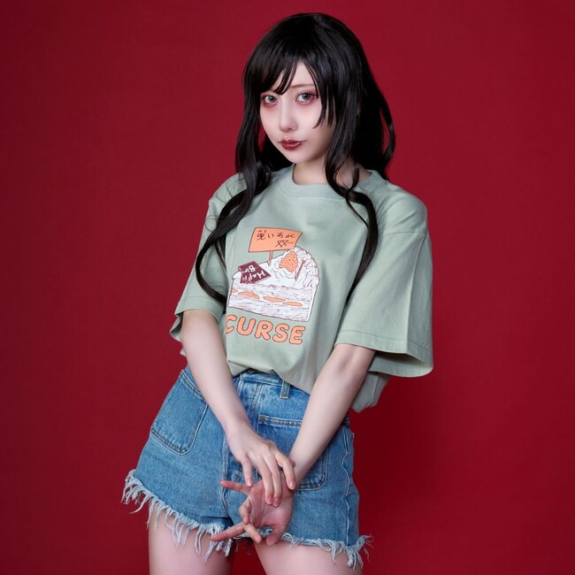 一見、切り分けられたケーキのカワイイTシャツに見えるが刺さる文字は「呪いあれ」。ポップなフォントのアルファベットは、CURSE=呪い。バックプリントの双一がいるということでお察しあれ。