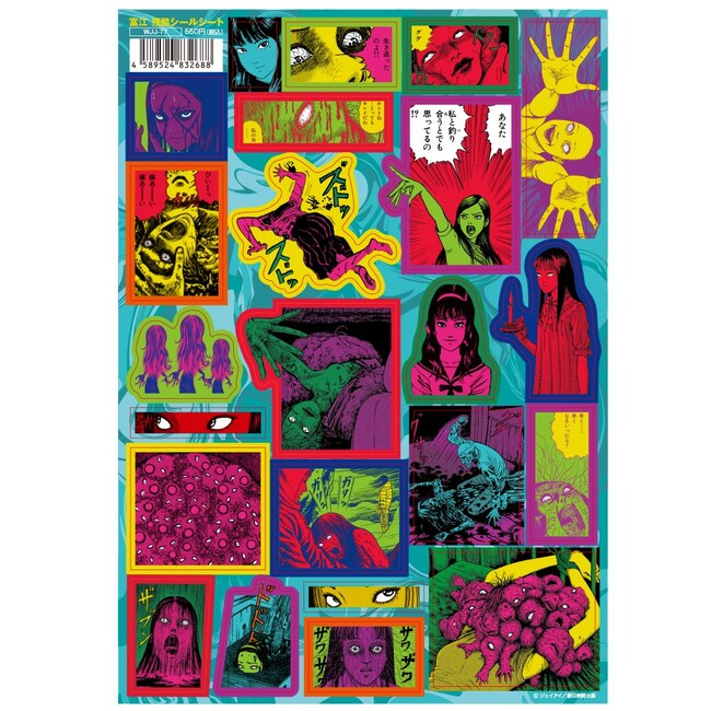 さまざまな富江が記録されたカラフルシールシート。一見ポップだけれど、よく見るとそこには恐るべき景色が広がる……!