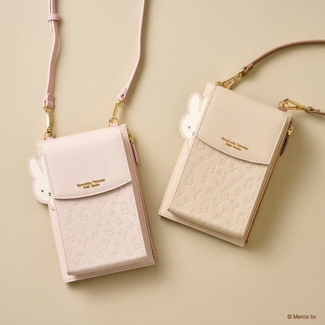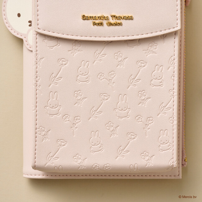 スマホショルダーバッグはお財布と同様にお散歩中のミッフィーと花柄をあしらった型押しデザインで世界観を表現。サイド部分にはこちらを覗いているミッフィーがポイントで、ミッフィーファンにはたまらない心を癒すデザイン。
