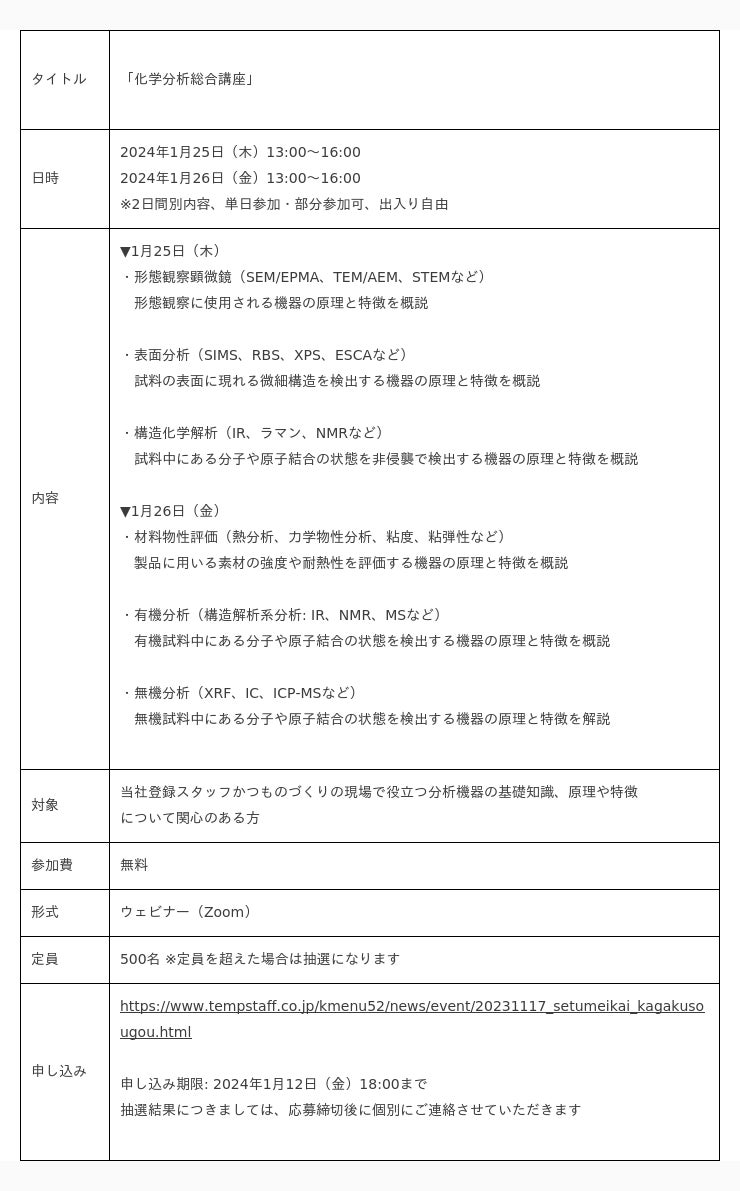 総合人材サービスのパーソルグループで人材派遣・アウトソーシング事業を手掛けるパーソルテンプスタッフ株式会社(本社: 東京都渋谷区、代表取締役社長: 木村 和成、以下パーソルテンプスタッフ)は、「化学分析総合講座」をテーマとし、無機・有機、さまざまな化学分析機器について学べる無料ウェビナーを2024年1月25日(木)・26日(金)に開催します。