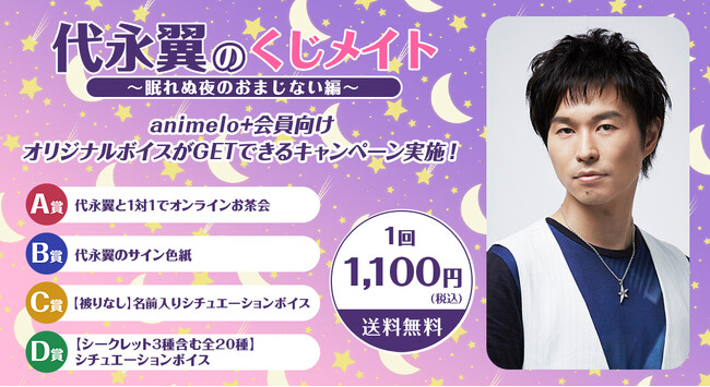 12月11日(月)より販売開始の「代永翼のくじメイト~眠れぬ夜のおまじない編~」は、アニメイト通販内で購入できるはずれなしのオンラインくじサービスです。