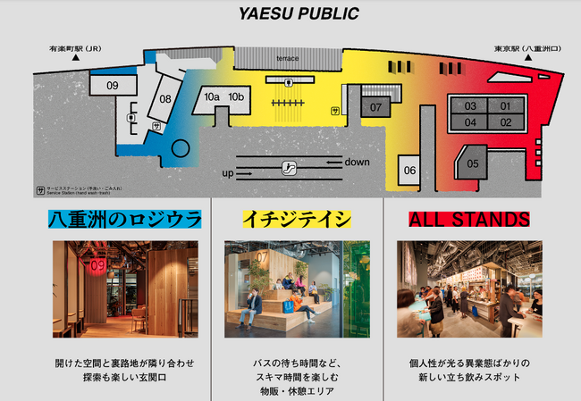 東京ミッドタウン八重洲2階の「ヤエスパブリック」は3つのエリアで構成されており、今回当社のモバイルオーダーシステムが採用されたのは「ALL STANDS」エリアとなります。