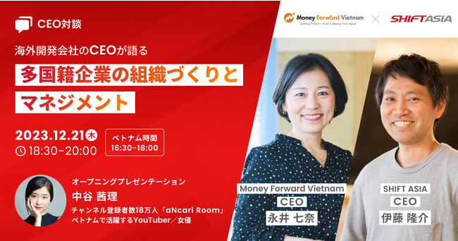 ベトナムでソフトウェア開発およびソフトウェアテストサービスを提供するSHIFT ASIA CO., LTD.(本社:ベトナム ホーチミン、CEO:伊藤 隆介、以下SHIFT ASIA)は、同じくベトナムにてインターネットサービス開発を行うMoney Forward Vietnam Co., Ltd.(本社:ベトナム ホーチミン、CEO:永井 七奈、以下Money Forward Vietnam)のCEO永井七奈さんをお招きし、2023年12月21日(木)に「【CEO対談】海外開発会社のCEOが語る、多国籍企業の組織づくりとマネジメント」と題した無料セミナー(オンライン・オフライン同時開催)を開催します。