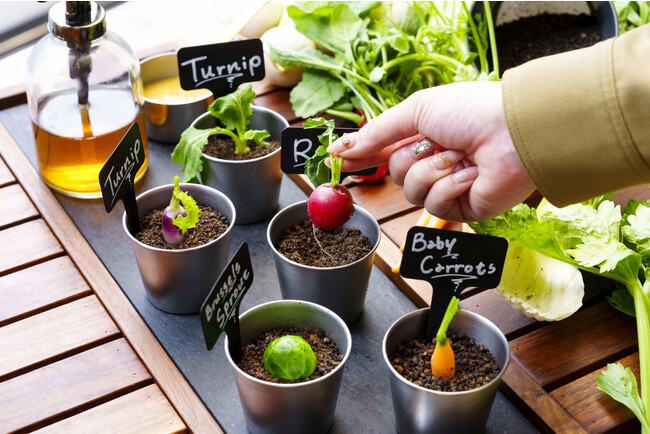 「こだわり野菜の収穫祭」は、プランターに見立てた器に国産野菜を入れた、見た目も味も食べ方も楽しめるサラダ。器の中にはサラダが三層になっています。一番下にはブロッコリーとベーコンのサラダ、二層目にフレンチ風のレンズ豆のサラダ、一番上には土に見立てた黒オリーブのピューレとカリカリに乾燥させたバケットをミックスしたものをのせました。食べる際は、じょうろに入った野菜の出し汁を土にかけて、下味をつけます。その後、プランターに植えられた新鮮な野菜を手で収穫し、シェフ特製のカレー風味のシーザーサラダドレッシングにディップしてお召し上がりください。最後は全体をミックスしながら、出し汁やドレッシングを追加頂くことで、味の変化をお楽しみいただけます。