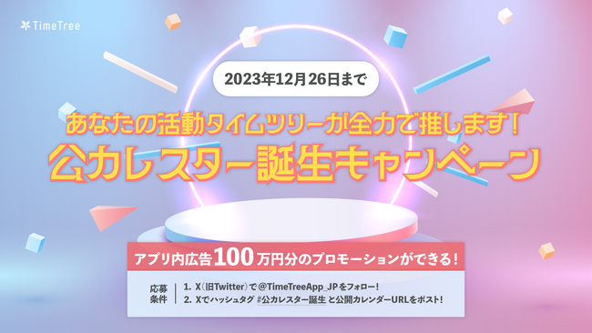 カレンダーシェアアプリ「TimeTree」(タイムツリー)を運営する株式会社TimeTree(本社:東京都新宿区、代表取締役社長:深川 泰斗)は、カレンダー形式でだれでも気軽にイベント情報を発信できるプラットフォーム「TimeTree 公開カレンダー」でカレンダーを運営するグループや個人を対象に、「TimeTree内100万円分の広告配信」を始めとするTimeTreeからの活動サポートが抽選で当たる「公カレスター誕生キャンペーン」を開催いたします。