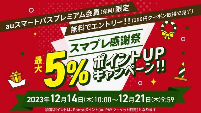 auスマートパスプレミアムは、日々のお買い物や、映画などのエンタメにお使いいただけるおトクなクーポンをはじめ、楽しく過ごすデジタルコンテンツや、スマホのピンチを解決する、安心を提供するサービスです。この度2023年12月14日から21日までの期間、5,000円以上で使える100円クーポンプレゼントと、auスマートパスプレミアム会員を対象にご購入金額の最大5%のPontaポイント(au PAY マーケット限定)を追加で還元する「スマプレ感謝祭」を開催します。