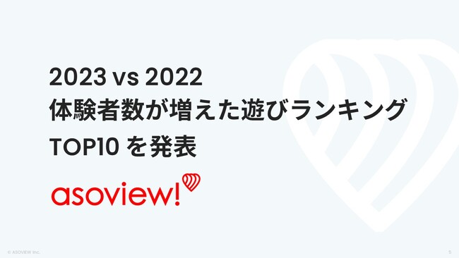 休日の便利でお得な遊び予約サービス「アソビュー!」(URL:https://app.adjust.com/138x1dst 、以下:アソビュー!)を運営するアソビュー株式会社(所在地:東京都品川区、代表執行役員CEO:山野智久、以下:当社)は、アソビュー!で2023年1月1日から12月3日までに予約・催行された実績データを基に、「体験者数が増えた遊びランキング」として、昨年に比べて今年特に体験者数が増えたアクティビティのジャンルをランキング形式でまとめ、最新トレンドとともに発表いたします。