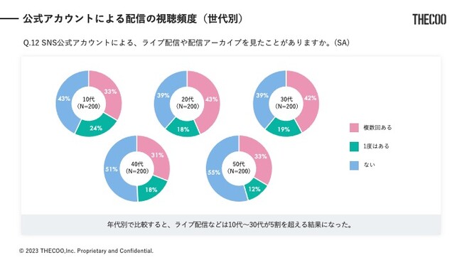 公式アカウントからのライブ配信や配信アーカイブをみたことがあると回答したのは全体の55%。年代別で比較すると、ライブ配信などは10代~30代が50%を超える結果になった。