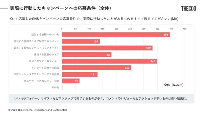 ・SNSキャンペーンの応募条件で参加経験が多いのは、いいね・フォロー・リポスト、シェアやコメントなどのユーザー側のアクションが多くなるものは少ない傾向にあった
