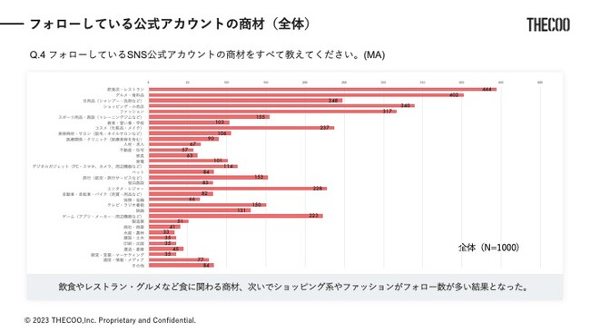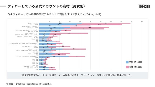 フォロー数が多い商材は飲食系・ショッピング、男女比較では男性はスポーツ用品やゲーム、女性はファッションやコスメが多かった