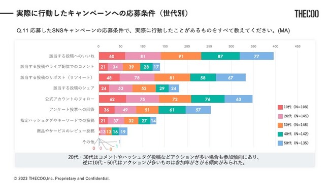「応募したSNSキャンペーンの応募条件で、実際に行動したことがあるものをすべて教えてください」という質問に対しては、いいねや公式アカウントのフォロー、リポストが多い結果となった。年代別でみると、20代・30代ではコメントやハッシュタグ投稿などアクションが多いものも参加率が高い傾向があり、逆に10代50代はアクションが多いものだと参加率がやや下がる傾向がみられた。