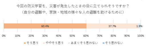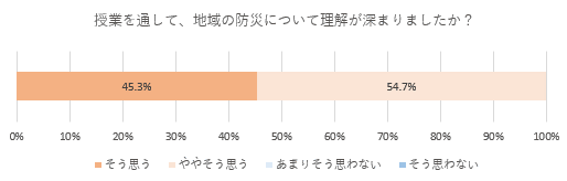 また、自由記述欄においては「地震発生時にこの場所は危ないor通れなくなりそうという話をしながら歩いた」「普段私たちが歩いている道は障がいのある方にとっては非常に通りにくい道であることが分かった」といった意見が寄せられ、自分自身以外の立場の方の避難も想像しながらワークショップを行ったことで、避難行動というものを見つめなおし、様々な立場の人へ配慮が必要となることを意識するきっかけとなったようです。また「地域の地形や新しい発見ができたのでとても楽しかった」というように、普段使っている場所の魅力に改めて気づくことができた学生もいました。