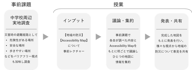 【バリアフリー視点×自身の体験×データ】を掛け合わせて検討し、生徒同士の対話を通じて、様々な生活者にとっての地域防災について、新たな気づきが得られるプログラムとなっています。