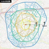 図1:到達圏マップ(健常者・高齢者・障がい者等の15分間での到達圏を表現した地図)
