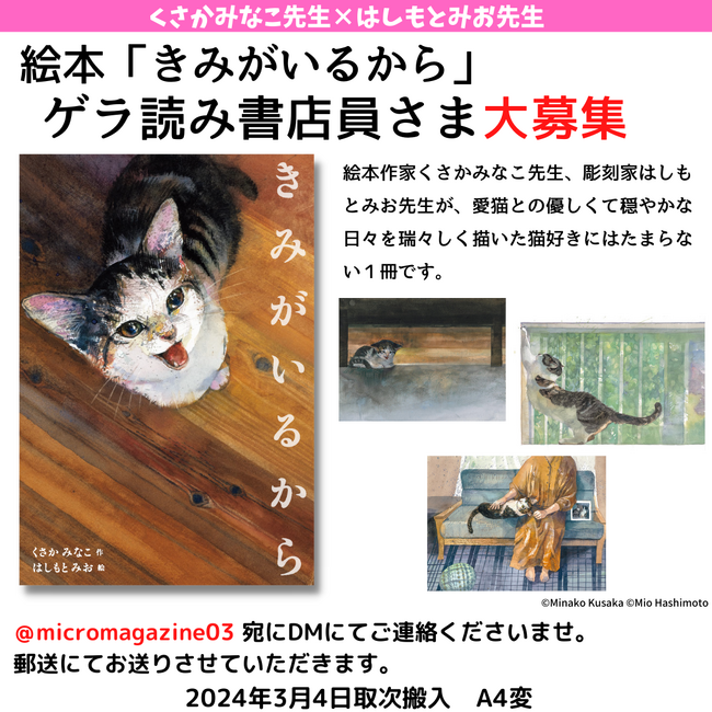 マイクロマガジン社(東京都中央区)は、2024年3月刊行予定の新作絵本『きみがいるから』のゲラ(校了前の原稿)を読んでくださる書店員さまを募集いたします。