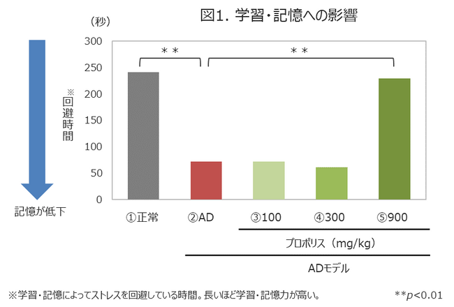 一方、5.プロポリス(900mg/kg)投与群においては、2.ADモデル群と比較して、学習・記憶障害が抑制された(図1)。