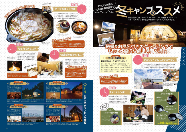 さらに、お手軽キャンプ飯やたき火を楽しみながら快適に過ごせる「冬グランピング」、旬を迎えた「カキ&イチゴの冬グルメ」、2024年3月までの情報を網羅した「イベントセレクション55」など、冬のおでかけのヒントが詰まった九州レジャーガイドの決定版です。