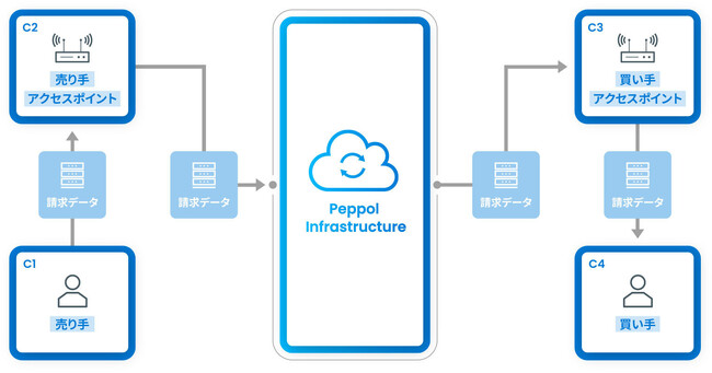 Peppol(Pan European Public Procurement Online)は、請求書(インボイス)などの電子文書をネットワーク上でやり取りするための「文書仕様」「運用ルール」「ネットワーク」のグローバルな標準仕様であり、OpenPeppol(ベルギーの国際的非営利組織)がその管理等を行っています。現在、欧州各国のみならず、オーストラリア、ニュージーランドやシンガポールなどの欧州域外の国も含め30か国以上で利用が進んでいます。日本の管理局はデジタル庁で、デジタルインボイスの標準仕様である「JP PINT」は、売り手のアクセスポイント(C2)と買い手のアクセスポイント(C3)との間でやり取りされるデジタルインボイスの標準仕様です。