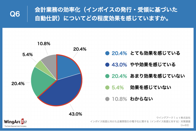 Q2で「すでに対応済み」と回答した方に、Peppolの導入後の後続業務について、「Q6.会計業務の効率化(インボイスの発行・受領に基づいた自動仕訳)についてどの程度効果を感じていますか。」(n=93)と質問したところ、「とても効果を感じている」が20.4%、「やや効果を感じている」が43.0%という回答となりました。