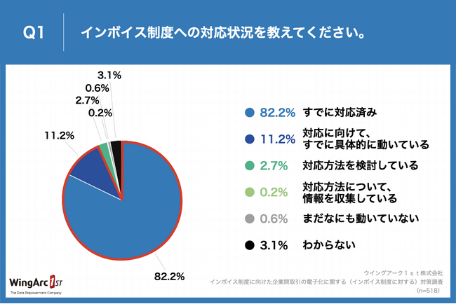 「Q1.インボイス制度への対応状況を教えてください。」(n=518)と質問したところ、「すでに対応済み」が82.2%、「対応に向けて、すでに具体的に動いている」が11.2%という回答となりました。