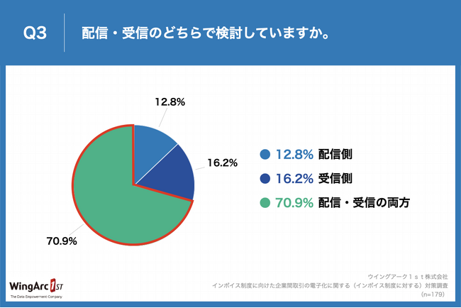 Q2で「すでに対応済み」、「対応する予定である」と回答した方に、「Q3.配信・受信のどちらで対応済み、または検討していますか。」(n=179)と質問したところ、「配信・受信の両方」が70.9%という回答となり、前回調査実施時(2023年8月)の61.7%から+9.2ptとなりました。