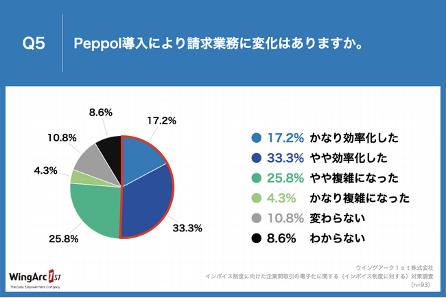 Q2で「すでに対応済み」と回答した方に、「Q5.Peppol導入により請求業務に変化はありますか。」(n=93)と質問したところ、「かなり効率化した」が17.2%、「やや効率化した」が33.3%という回答となりました。