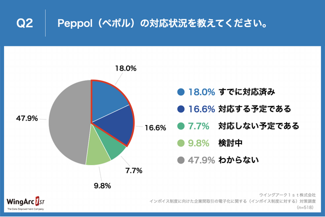 「Q2.Peppol(ペポル)の対応状況を教えてください。」(n=518)と質問したところ、「すでに対応済み」が18.0%、「対応する予定である」が16.6%という回答となりました。前回調査実施時(2023年8月)から4か月で、Peppol対応予定・対応済みは+11.2pt伸長しました。