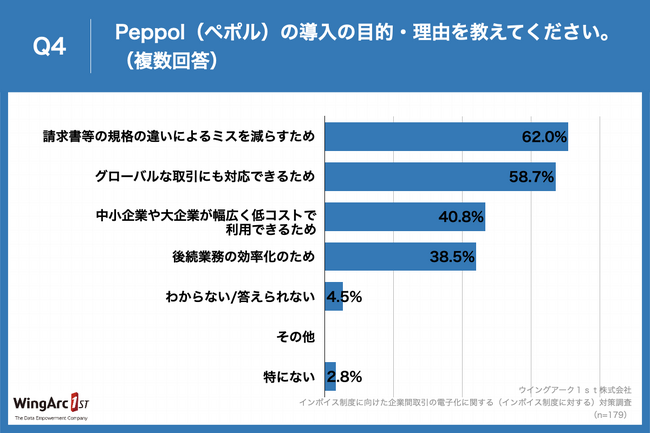 Q2で「すでに対応済み」、「対応する予定である」と回答した方に、「Q4.Peppol(ペポル)の導入の目的・理由を教えてください。(複数回答)」(n=179)と質問したところ、「請求書等の規格の違いによるミスを減らすため」が62.0%、「グローバルな取引にも対応できるため」が58.7%、「中小企業や大企業が幅広く低コストで利用できるため」が40.8%という回答となりました。
