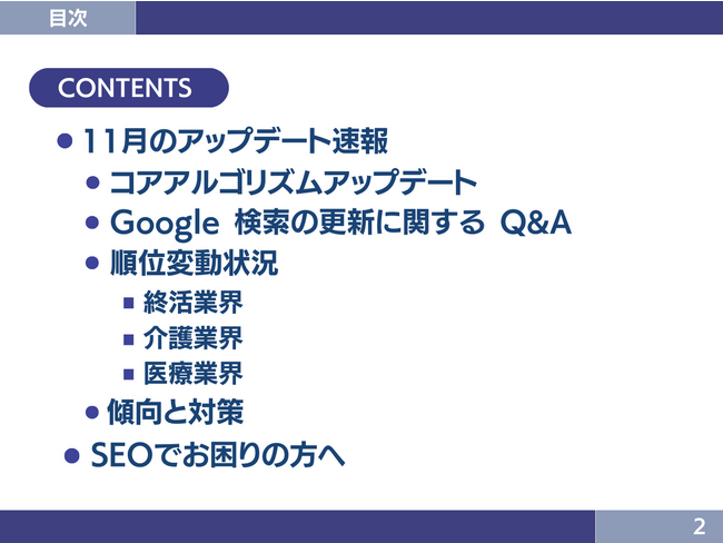 今回のレポートでは11月の「コアアルゴリズムアップデート」による順位の変動速報や対策についての見解を示しています。