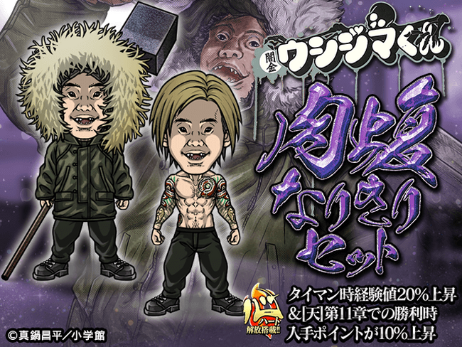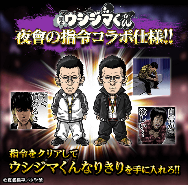 本コラボでは、プレイヤーが「カウカウファイナンス」の一員として「集金袋」を集める特別イベント「闇金ウシジマくん 集金くん編」の他、指令を達成することでウシジマくんなりきりアバターが手に入る「闇金ウシジマくん×夜會の指令」を開催します。
