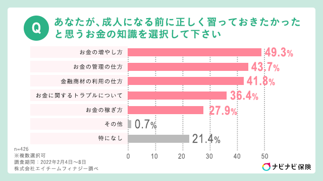 当社が過去に実施した、20歳から70歳以下の男女426名を対象にした「学校での金融教育に関する意識調査」によると、成人になる前に「お金の増やし方」を教わりたかったと回答した人は49.3%、「お金の管理」を教わりたかったと回答した人は、43.7%でした。(複数回答有)