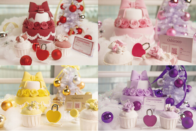 クレイアート作家によるホールケーキとカップケーキ、さらにオーナメントまでカラーコーディネートされたミニツリーがセットされ、7色展開でずらりと並びます。