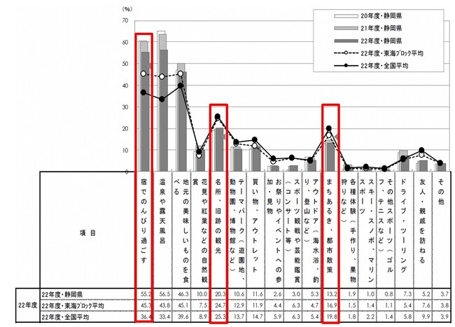 静岡県への旅行の目的は、「宿でのんびり過ごす」は高いが、「名所、旧跡の観光」「まちあるき、都市散策」がともに全国平均より5ポイント以上低い