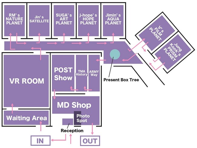 メンバーそれぞれの名前が付けられた7つの惑星「INSIDE PLANET」は、 “自然と芸術に対する情熱を持ったRM”“多方面に芸術的才能を持つSUGAに似たような多彩なネオントーンの空間”など、それぞれ異なるコンセプトで飾られています。