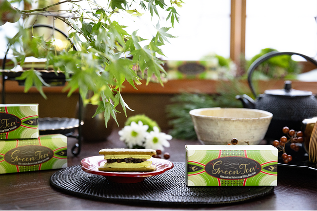 宇治抹茶をふんだんに使用したことで誕生した抹茶バタークリームサンドは、その味わいだけでなく見た目も「和洋折衷」の テイストをコントラスト豊かに演出します。
