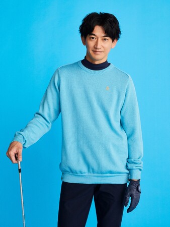 加えて、長年ゴルフウェアを展開してきた『マンシングウェア』の知見を生かしてゴルフにふさわしい工夫を施しています。1点目は編み方。表側にウール、裏側に化繊の交撚糸が出るように編まれているため、『マンシングウェア』らしい上品な質感はそのままに、汚れやすく、洗濯頻度の高いゴルフウェアにおいても自宅での洗濯を可能にしています。2点目は裾のディテール。裾についているボタンを外すことにより、スイング時の体をひねる動きの際に裾が上がってきません。3点目はパターン設計。肩回りを動かしやすくする「サドルショルダー」を採用し、裾の仕様と合わせ快適にスイングできるよう工夫しています。
