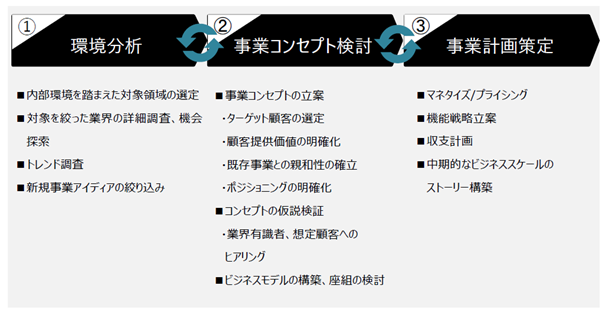 「BtoB新規事業開発支援サービス」はBtoBをビジネスモデルとした新規ビジネスのコンセプト検討から事業計画書策定まで、お客様が希望するフェーズを支援するサービスです。