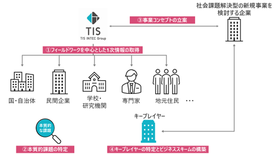 今回追加した新メニューは、企業が社会課題解決型の新規事業を開発する際に、フィールドワークを重視した環境分析や事業コンセプトの検討などの企画フェーズから事業計画策定までを、TISが伴走型で支援します。例えば、コンセプト検討において、専門家や想定顧客、パートナー候補先等へのインタビュー、ヒアリングを行い1次情報を活用した確度の高い事業コンセプトを立案します。