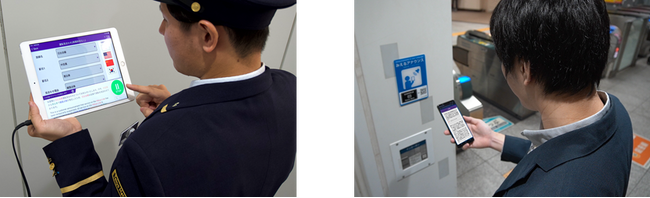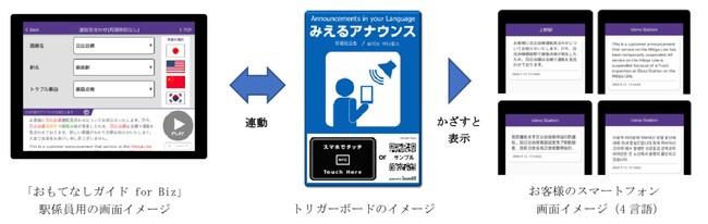 本サービスは、駅係員が操作して多言語のアナウンスを放送できるタブレット/スマートフォン向けアプリ「おもてなしガイド for Biz」と、お客様がお持ちのスマートフォンをかざすかQRコードを読み取ることで