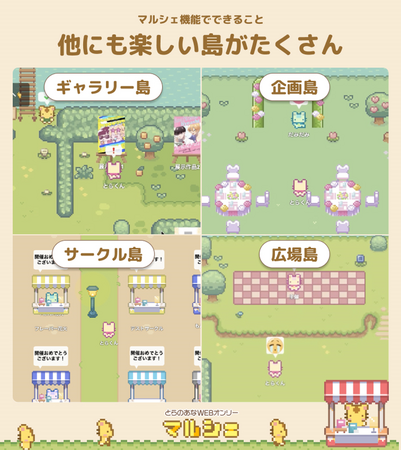 島でマルシェを催すような雰囲気でアバターキャラを操作して、リアルタイムで参加者様同士が自由な交流を楽しめます。 ※当面はベータ版として無料で公開予定