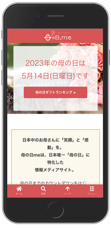 母の日についての様々な情報を発信している、母の日に特化した情報メディアサイト「母の日.me」では、毎年の母の日はいつ?を解決してくれるコンテンツをはじめ、今人気の母の日ギフトがわかる300以上のギフトランキングなど、プレゼント選びでお悩みの方に役立つ情報を発信しています。