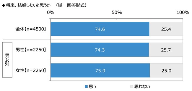 全回答者(4,500名)に、将来、結婚したいと思うか聞いたところ、「思う」は74.6%、「思わない」は25.4%となりました。