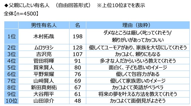 有名人を挙げた理由をみると、1位の「木村拓哉さん」では「ダメなところは厳しく叱ってくれそう」や「頼りがいがあってカッコいい」、2位の「ムロツヨシさん」では「優しくてユーモアがあり、家族を大切にしてくれそう」、3位の「吉沢亮さん」では「カッコよく、頼りにもなる」といった回答がありました。