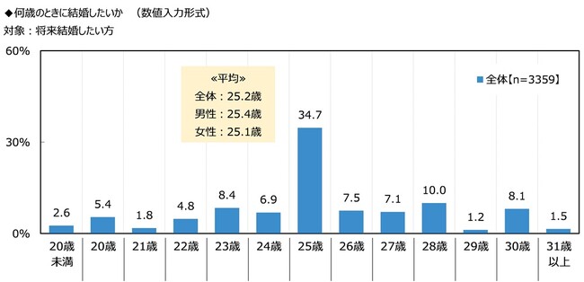 将来結婚したい方(3,359名)に、何歳のときに結婚したいか聞いたところ、「25歳」(34.7%)に最も多くの回答が集まり、平均は25.2歳でした。